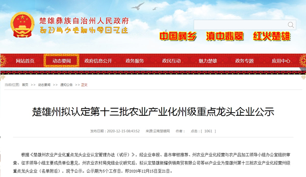 云南滇農集團有限公司楚雄公司被認定楚雄州...楚雄州擬認定第十三批農業產業化州級重點龍頭企業公示發布日期:2020-12-15 08:43:52 &n....